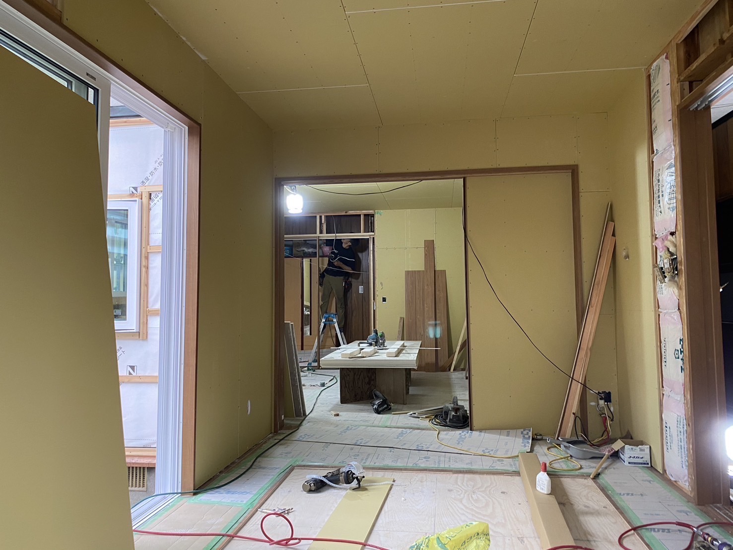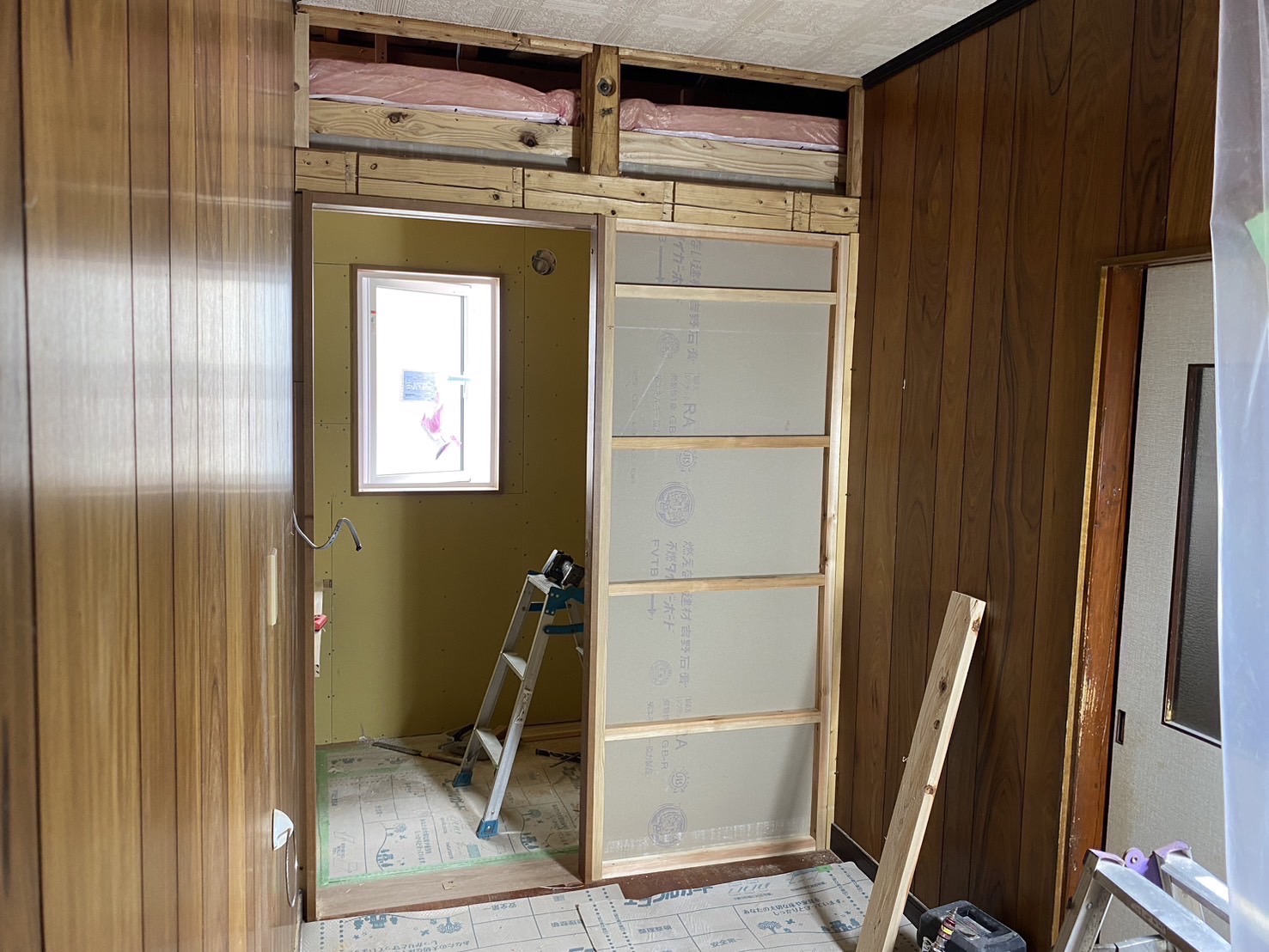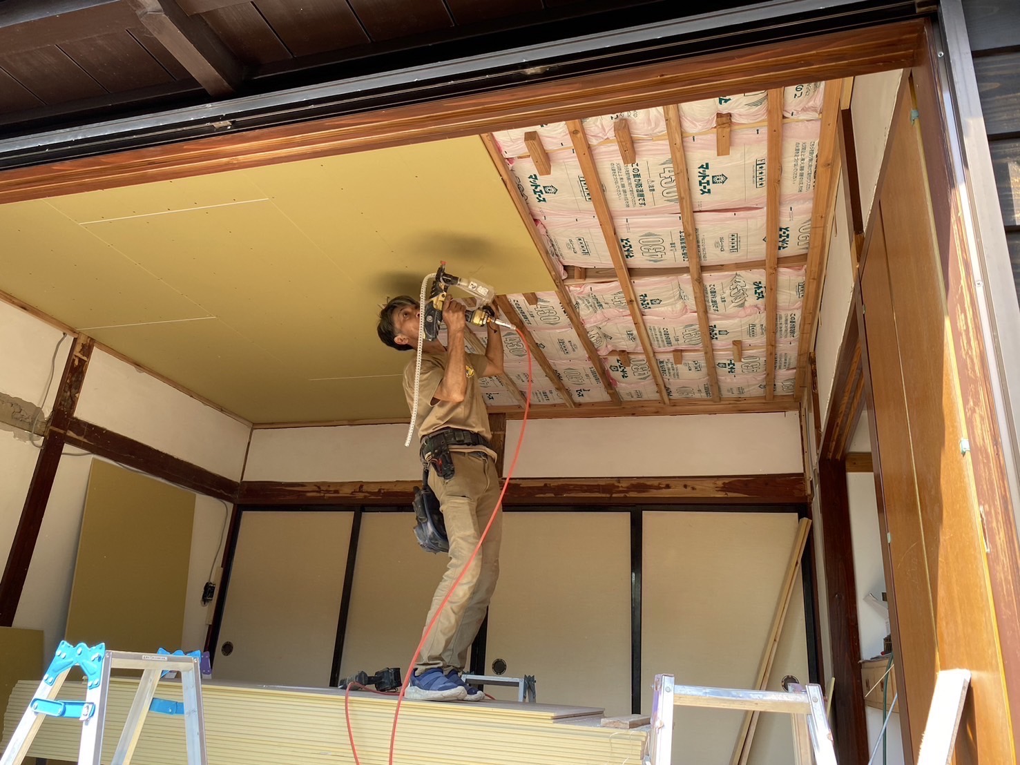 和室の改装床と天井を剥がし透湿防水シートと断熱材を隙間なく入れた後石膏ボードで蓋をして行きます。床面もフローリングを敷き詰めます。サッシも新しいものに交換しました。