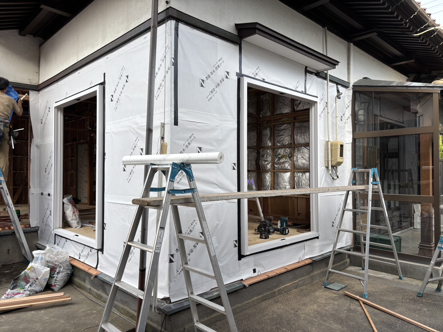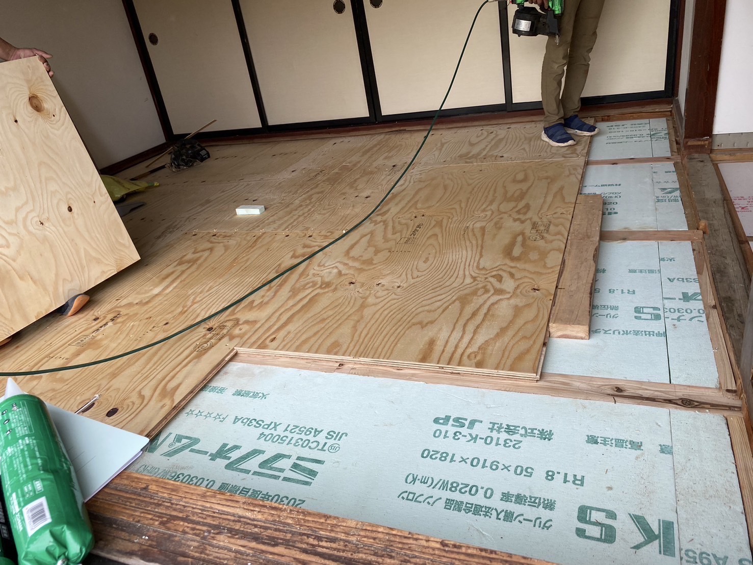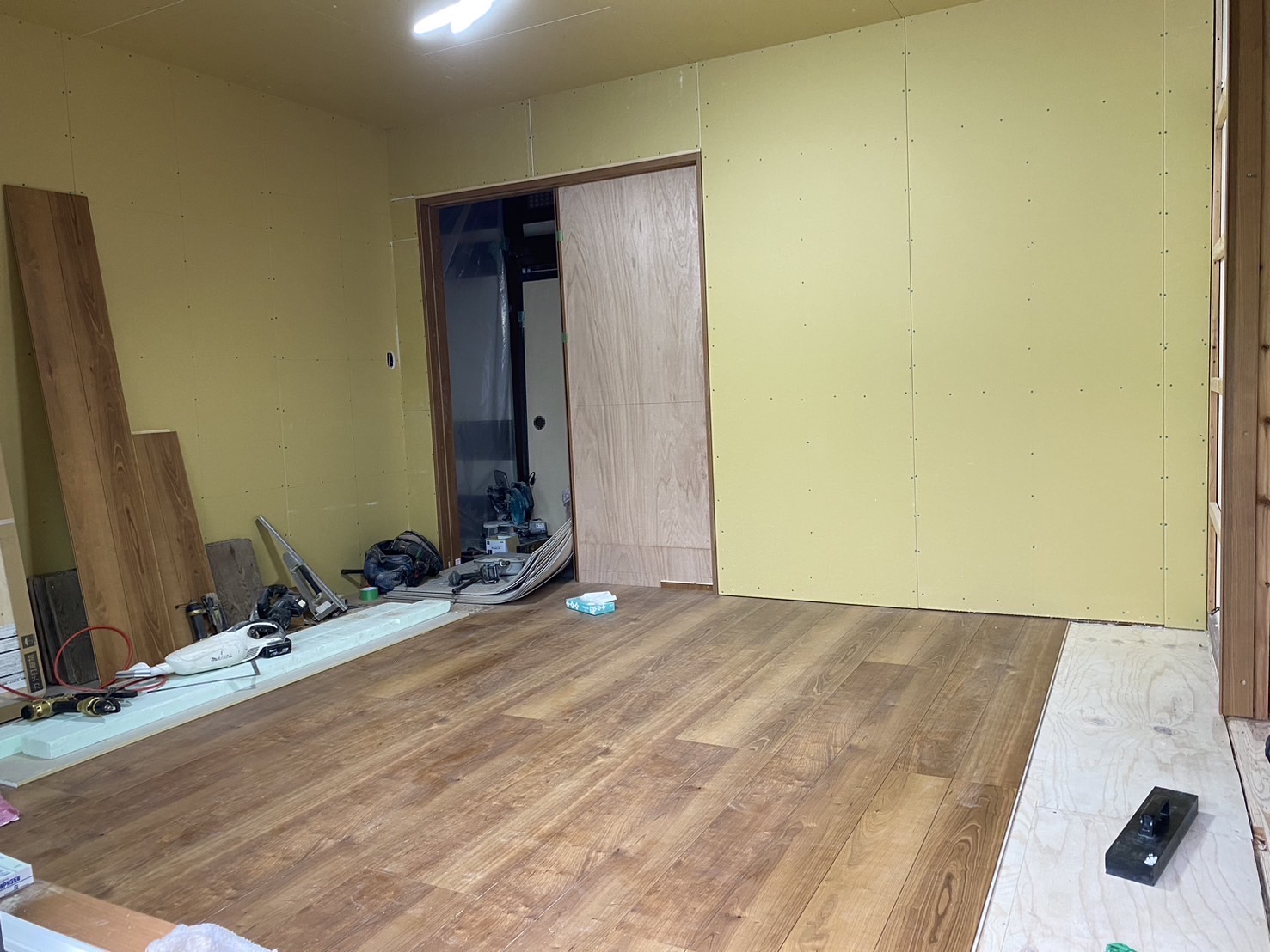 和室の改装床と天井を剥がし透湿防水シートと断熱材を隙間なく入れた後石膏ボードで蓋をして行きます。床面もフローリングを敷き詰めます。サッシも新しいものに交換しました。
