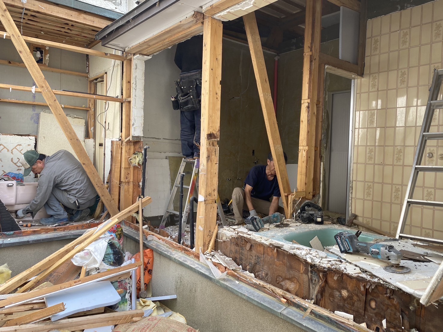 リビング、ダイニングキッチン、浴室、洗面部分も同じように一度既存のものを取り外し透湿防水シートや断熱材をしっかり入れ、石膏ボードや床材で蓋をして行きます。浴室はシステムバスを設置。浴室、洗面部分は配管も新しいものに取り替えています。