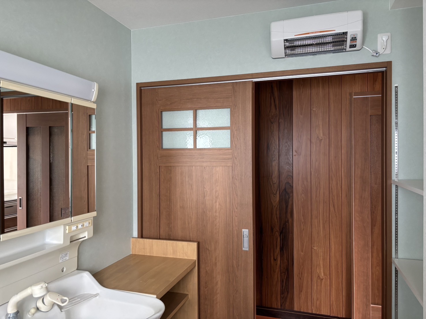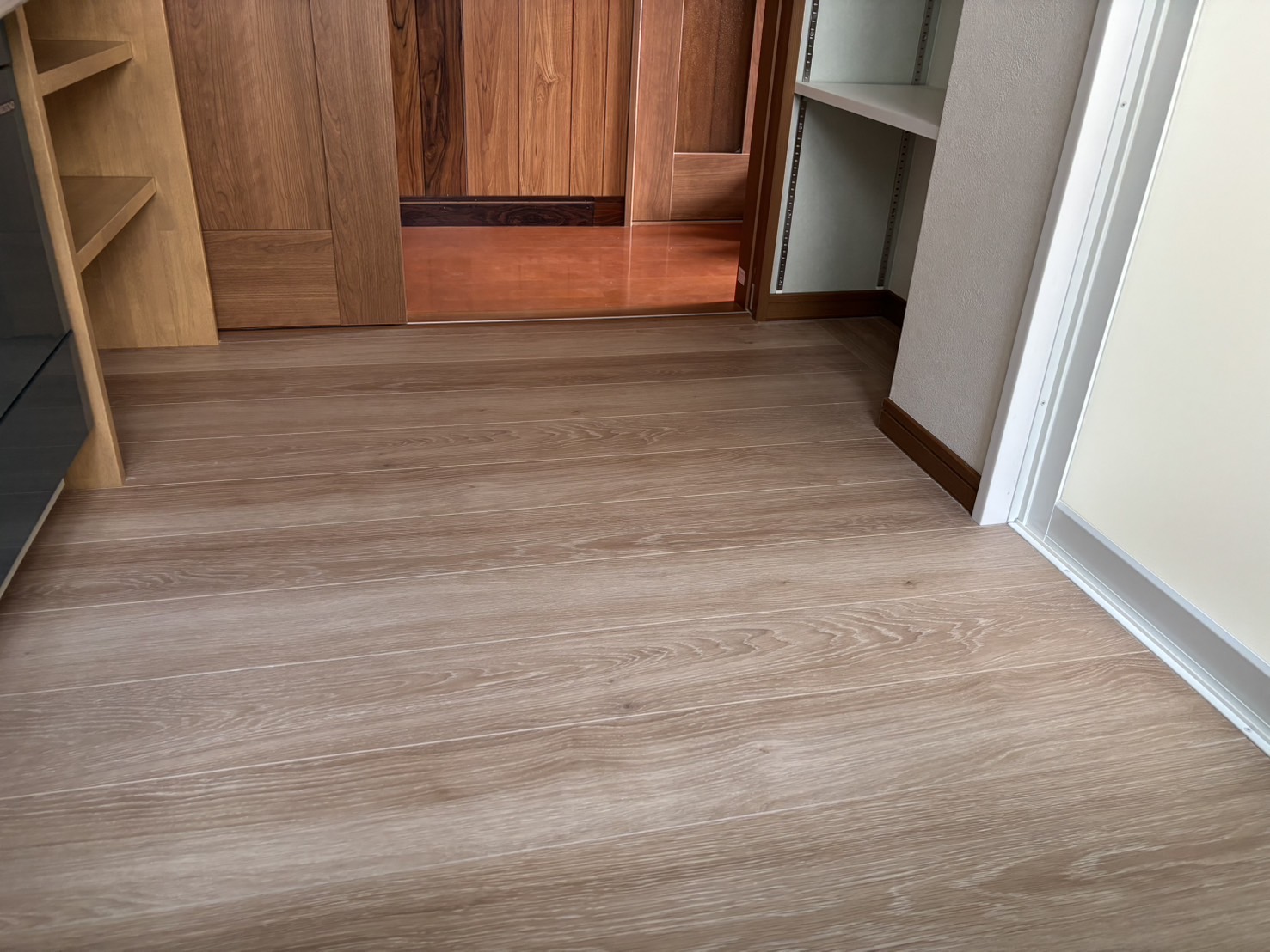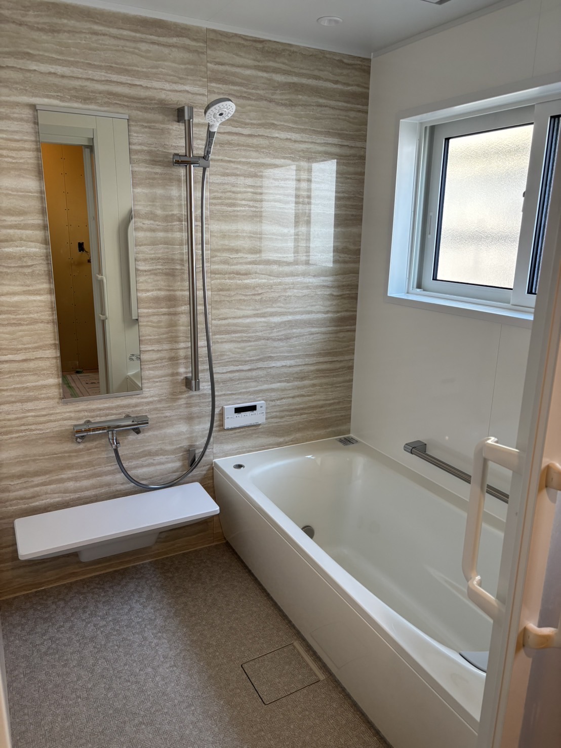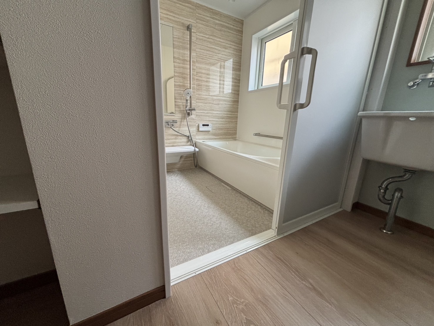 洗面、浴槽部分はこの様に仕上がりました。洗面入口、浴室入口は入口を広くし、段差を無くしてます。