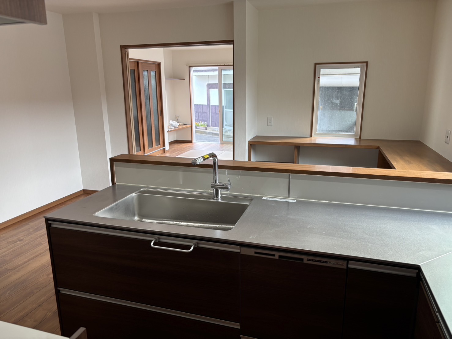 リビング、ダイニングキッチンの完成写真。こちらも段差無くしリビングには、大建工業社製の和モダン空間を作る畳風床材「ここち和座」を敷きました。