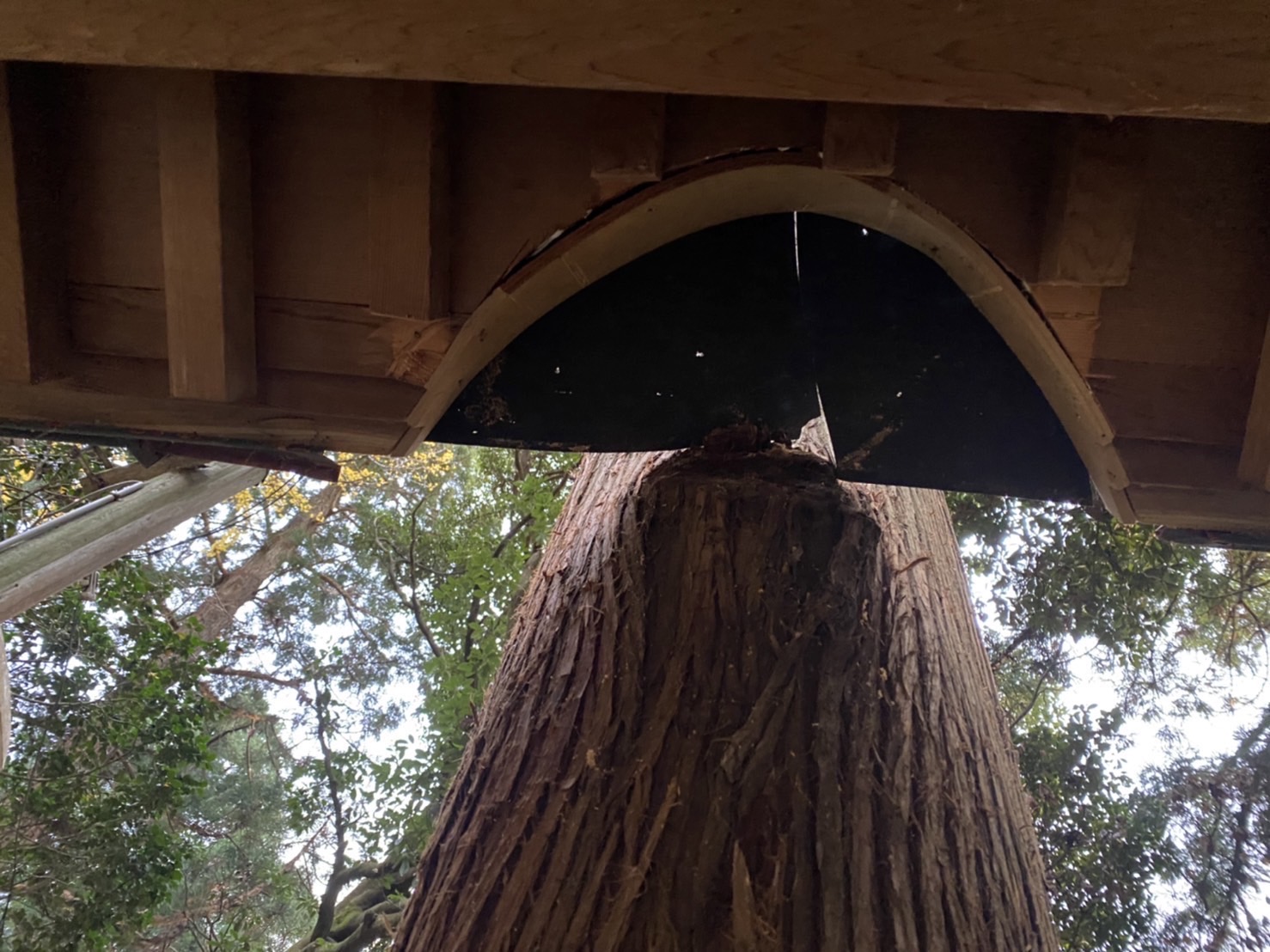 2021年12月6日 / 最終更新日時 : 2021年12月6日 manabukenchiku 施工事例 神社の手水舎屋根修理工事 【R3.12.6記事開始】 神社を参拝する時には、まず初めに鳥居の所で自分の衣服を整え、軽く一礼してから境内に入ります。次に参道脇に置かれている手水舎(てみずや、またはちょうずや)の水で両手を清め、口を濯ぎます。 今回のご依頼はその手水舎がご神木の成長によって押されて傾きが生じていたので、ご神木が手水舎に干渉しない様、修理してほしいとの事でした。 ご神木の周りに足場をかけ、手水舎の屋根をご神木に当たらない様に加工していきます。